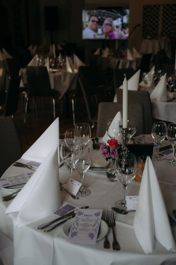 Vi valde inte heller något speciellt tema till bröllopet, men eftersom att både kyrkan och vår festlokal gick i nationalromantik jugendstil så ville vi även få den känslan på våra trycksaker i form av inbjudningskort, menyer och placeringskort. I övrigt fick de vackra byggnaderna stå för dekorationen som kulisser i sig och dukningen lämnade vi åt personalen på festlokalen.