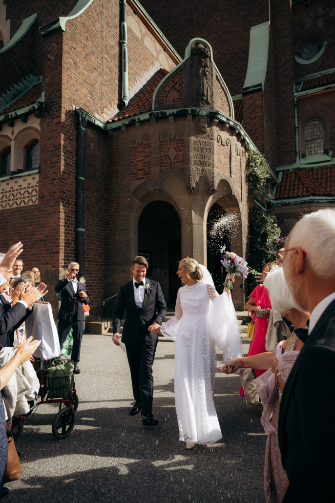 Vi gick tillsammans in i Engelbrektskyrkans underbart långa altargång till en klassisk bröllopsmarsch och det var otroligt att se all släkt och vänner som klätt upp sig så fint för att fira vår kärlek. Brudens syster sjöng två låtar under vigseln, Tycker om när du tar på mig av Per Gessle (för att få in lite Halmstad) och Utan dina andetag av Kent, inte ett öga var torrt. Ut ur kyrkan gick vi till Can’t help falling in love with you, eftersom våran kärlekssaga har gått ganska fort fram, men är det lätt så är det rätt.