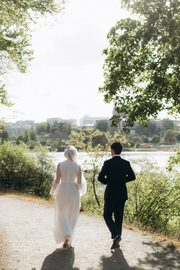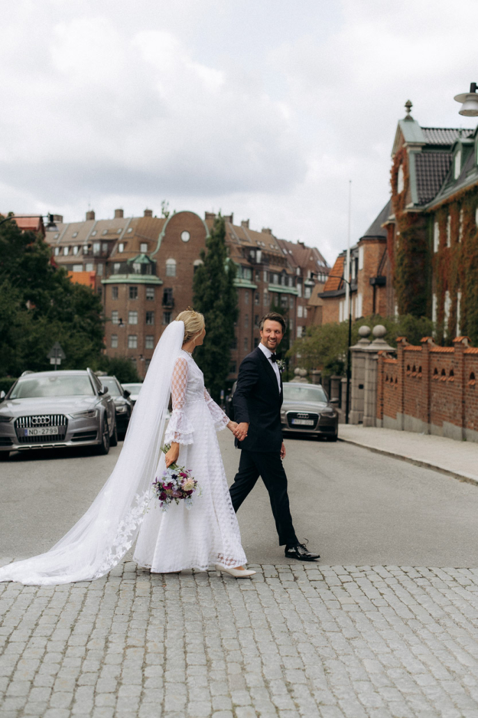 Vi valde två olika platser för bröllopsfotografering för att möta bådas våra önskemål. Bruden tyckte det var roligt att få fotas i stan, bland vackra hus och bilar i krokarna runt kyrkan, medan brudgummen som är från västkusten gärna ville ha bilder med vatten. Så mellan vigseln och festen åkte vi iväg till Hagaparken för att fotas vid Brunnsviken och nu i efterhand är det väldigt roligt att ha så olika typer av kort.