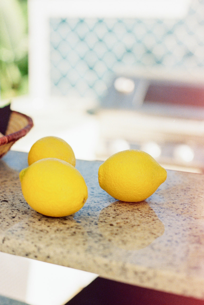 Temat inspirerades av vår citrontur till Amalfikusten, så vi valde ljusgula detaljer och citroner överallt. Mina brudtärnor hade gula klänningar – det passade perfekt till villans omgivningar.