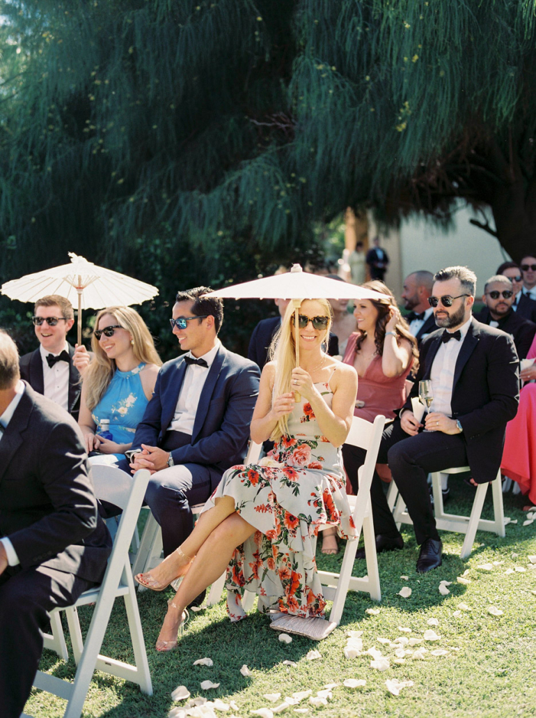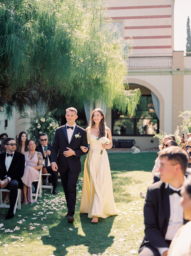 Vigseln var en kombination av allt vi älskar – den blev väldigt personlig och unik. Vi ville skapa en avslappnad och varm atmosfär, så vi började med att servera drinkar till gästerna före ceremonin. Chris gick upp längs gången tillsammans med min mamma till musik av Kygo, som vi älskar eftersom det är EDM och norskt. Brudtärnorna och marskalkarna gick upp till en låt av ODESZA, medan jag själv alltid drömt om att gå till fiolmusik.