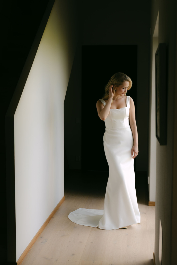 Esther: Jag visste alltid hur jag ville att klänningen skulle se ut – en väldigt klassisk och enkel klänning. Ingen spets och inget glitter. Jag åkte till Stockholm, chansade och ringde en butik och frågade om de hade en klänning med rak ringning, tjocka axelband, låg rygg och litet släp. Det hade de! Jag och mamma skyndade oss dit och provade – det kändes direkt! Den var IT!