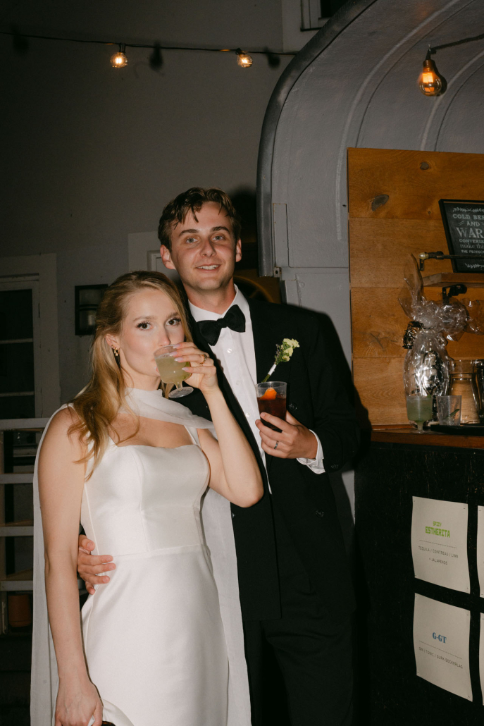 Under tiden som rätterna serverades hörde vi flera otroligt fina tal som fick oss både att skratta och gråta. Middagen blev verkligen perfekt. Vi blev så varma i hjärtat av att se alla våra vänner och vår familj i samma rum – alla vi älskar mest i världen! Därefter öppnades barvagnen på innergården. Där serverades bland annat ”Leoni” och ”Spicy Estherita” (Negronis och Margaritas). Det blev både dans i lokalen och på innergården under hela kvällen, trots att regnet återvände vid midnatt. Det blev en underbar fest som vi för alltid kommer att minnas.