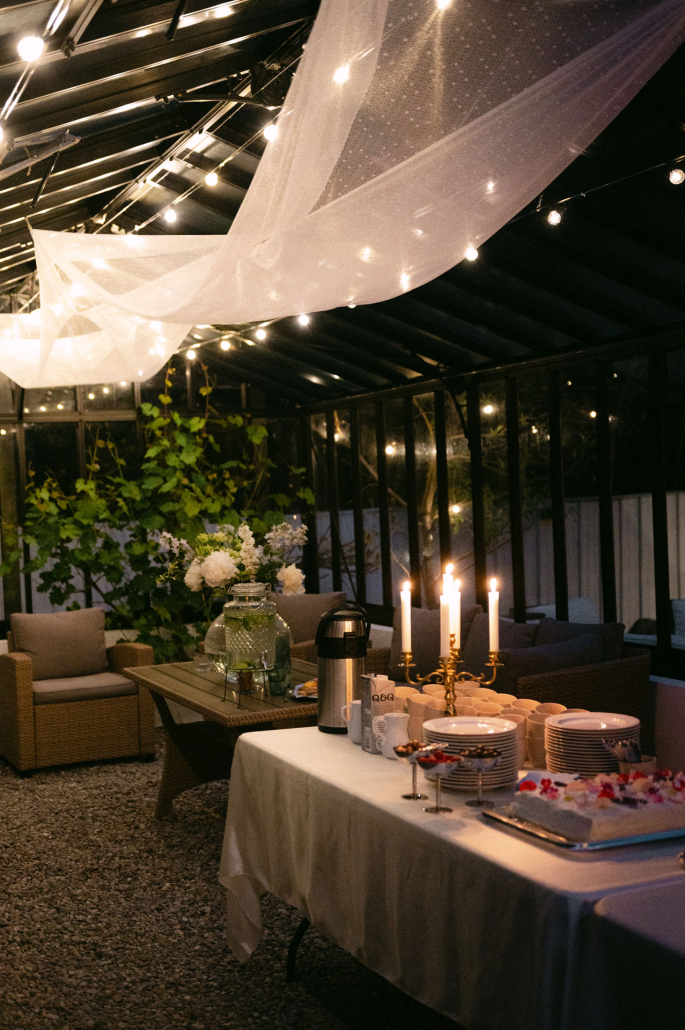 Det fanns också plats för en mobil barvagn vi hittat, som blev en kul detalj för gästerna och oss. Utöver det fanns ett större växthus där vi genast började leka med tanken att det skulle bli den perfekta platsen att servera bröllopstårtan.
