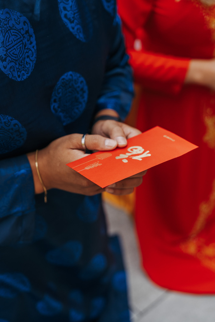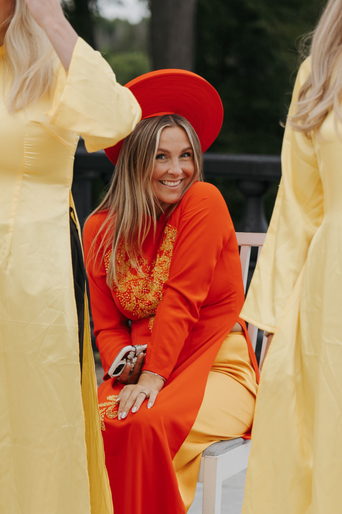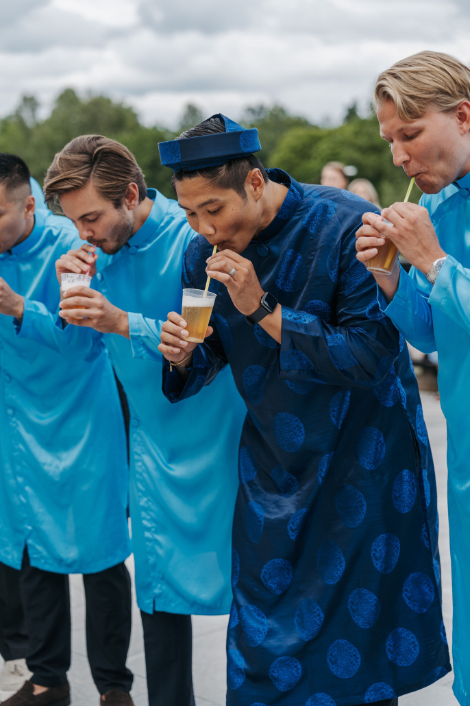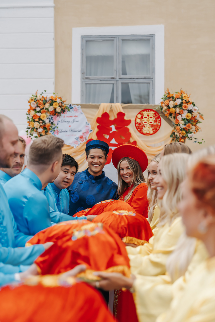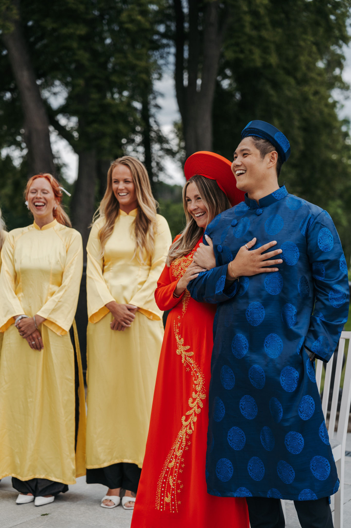 För att hylla Jens vietnamesiska arv hade vi en teceremoni där alla bar traditionella Ao Dai, skräddarsydda i Vietnam. Det var en vacker symbol för Jens kultur och en speciell del av firandet.