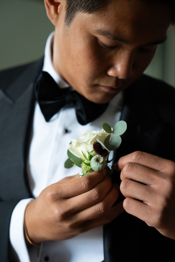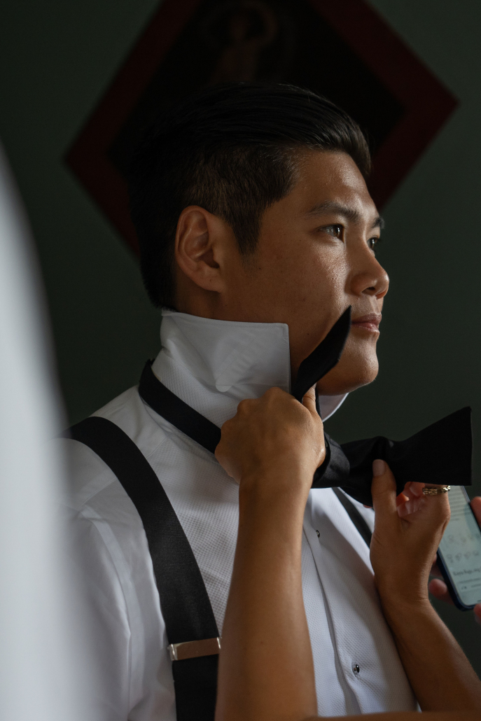 Jens detaljer höll sig till klassiska looken med handknuten fluga, manschettknappar och lackskor – svarta och vita kulörer.