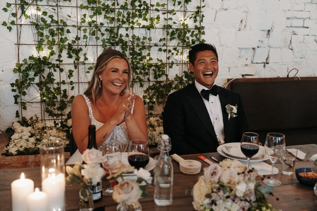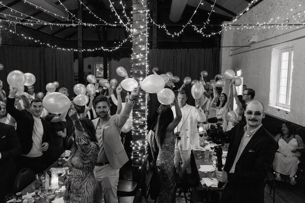 Vi ville att middagen skulle vara en riktig fest. Eftersom vi träffades under vår tid på högskolan och båda varit aktiva i föreningar och festmästerier, önskade vi att middagen skulle ha samma härliga stämning som en festmiddag i studentlivet. Att våra gäster skulle ha roligt var vår högsta prioritet. Därför valde vi våra toastmasters med stor omsorg och gav dem 110 % förtroende att planera hela middagen – från minglet klockan 15 fram till att lokalen stängde vid 02.