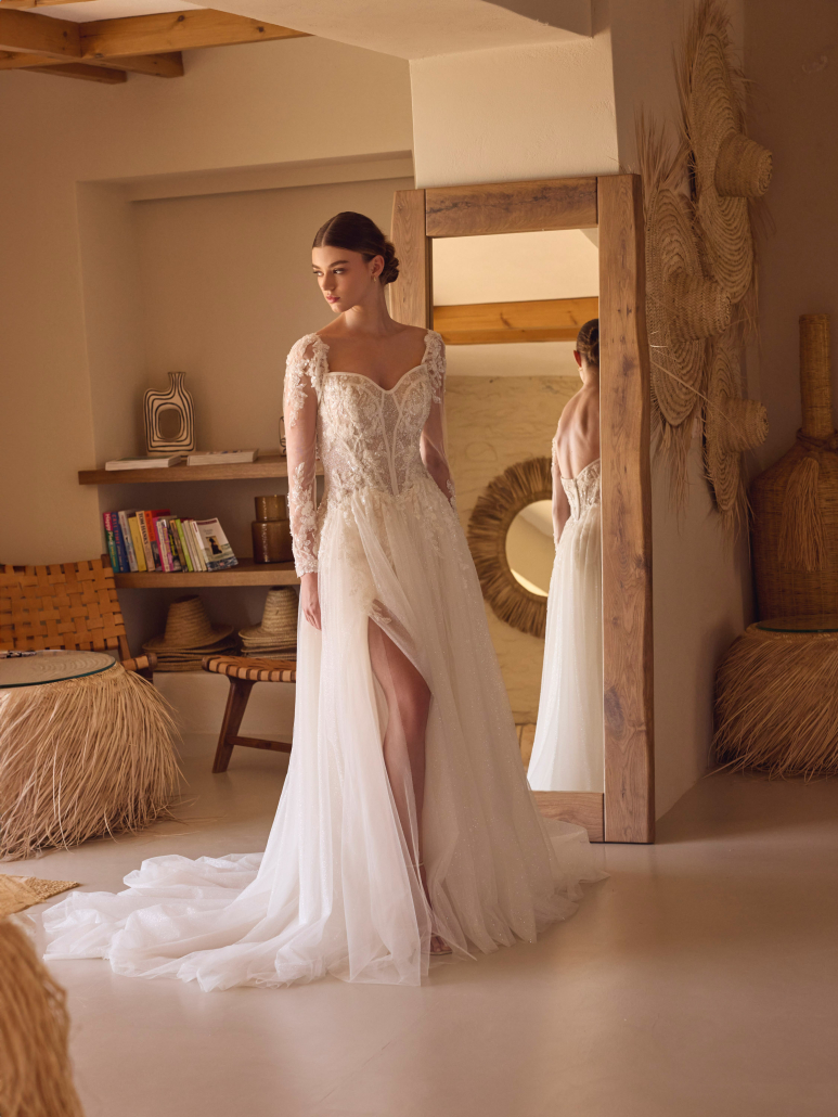 En av Modecas tydligaste trender denna säsong är brudklänningar med avtagbara detaljer. Många brudar älskar möjligheten att förändra sin look under dagen med avtagbara ärmar, överkjol eller ett dramatiskt släp. Dessa flexibla element ger flera uttryck i en och samma klänning och gör övergången från vigsel till fest både sömlös och personlig – utan att kompromissa med elegansen.