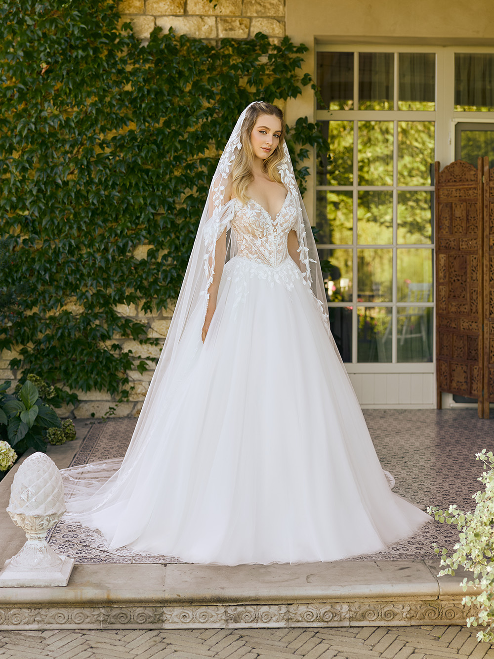 Denna romantiska tyllklänning har en sofistikerad cat-eye-ringning som vackert ramar in dekolletaget och ger en modern tolkning av den klassiska off-shoulder-designen. Det semitransparenta livet är dekorerat med subtila spetsapplikationer som mjukt fortsätter ner över kjolen och tillför dimension och skimrande detaljer. En voluminös tyllkjol fulländar silhuetten och skapar en eterisk, prinsesslik känsla – perfekt för ett sagolikt bröllop.
