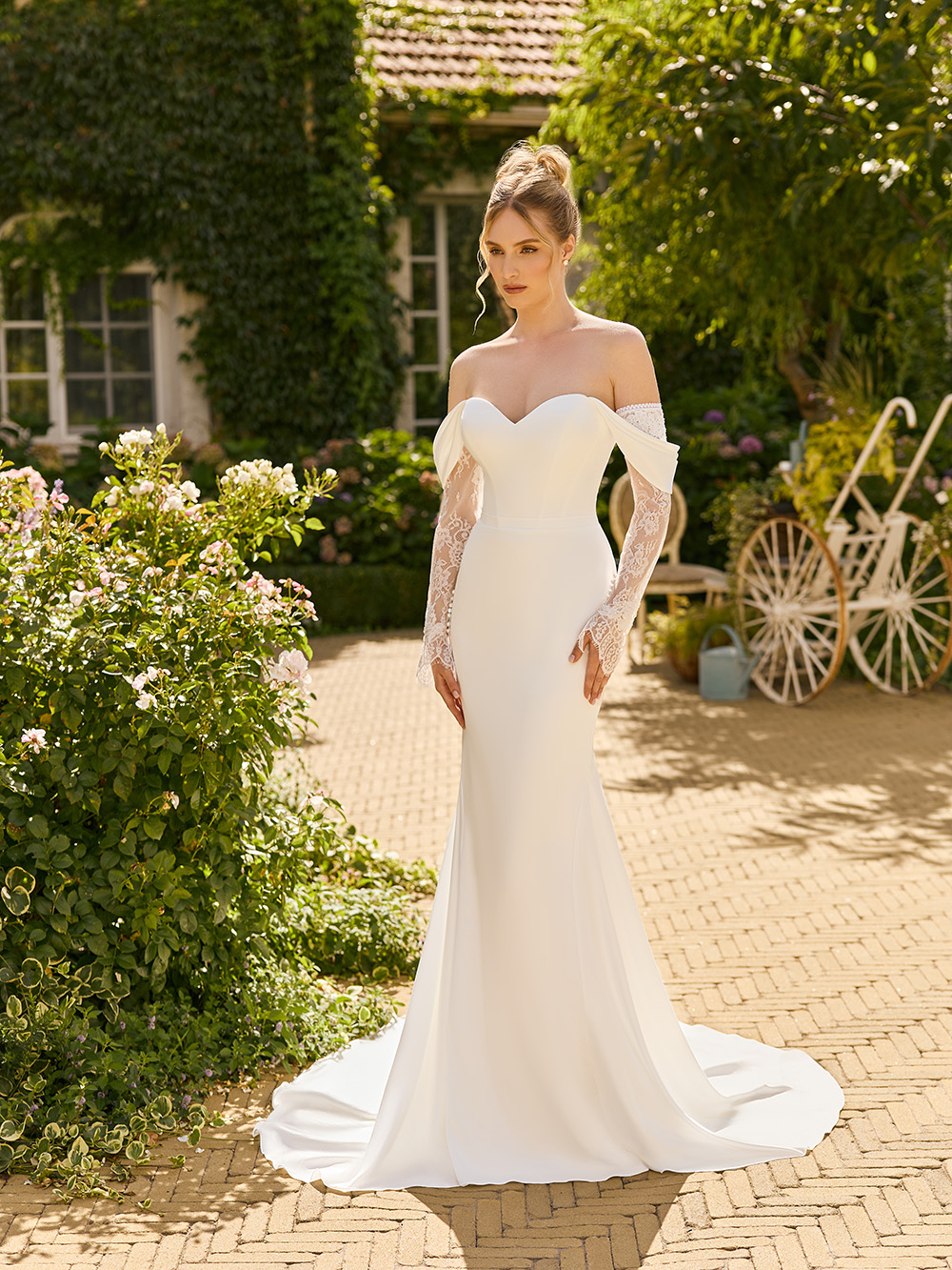 Denna stilrena satin-crepe-klänning har en skulpterad sweetheart-ringning som framhäver dekolletaget med naturlig elegans. Den figurnära silhuetten markerar kroppens linjer och övergår i ett rent, modernt släp för en sofistikerad finish. Avtagbara off-shoulder-ärmar med intrikata spetsdetaljer ger romantik och flexibilitet, så att bruden kan växla mellan klassiskt och modernt uttryck.