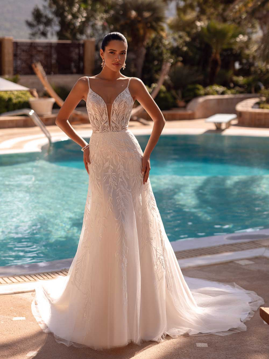 En drömlik bröllopsklänning i blommig spets. Livet i broderad organza spets kombineras med off shoulder-ringning, matchande ärmar (SL95 och SL96, säljs separat) och ett maxat ball gown-kjol. Komplettera looken med det matchande spets-halsbandet (COL12, säljs separat) för ett sagolikt helhetsintryck.