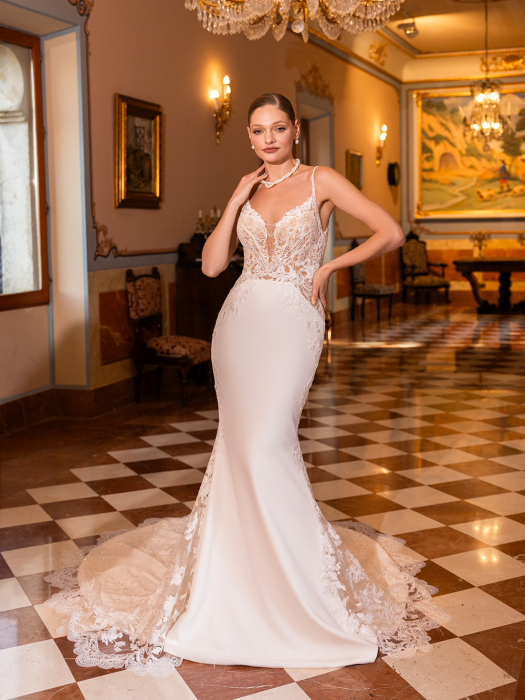 Ett sant uttryck för Demetrios elegans. Style 1518 är en bröllopsklänning som förenar vintagekänsla med modern glamour. Den strukturerade korsettlivdelen med synlig benstomme och romantiska spetsdetaljer övergår sömlöst i en generös A-linjekjol i elegant Mikado eller satin. En klassisk snörning i ryggen och ett svepande släp fulländar denna minnesvärda silhuett.
