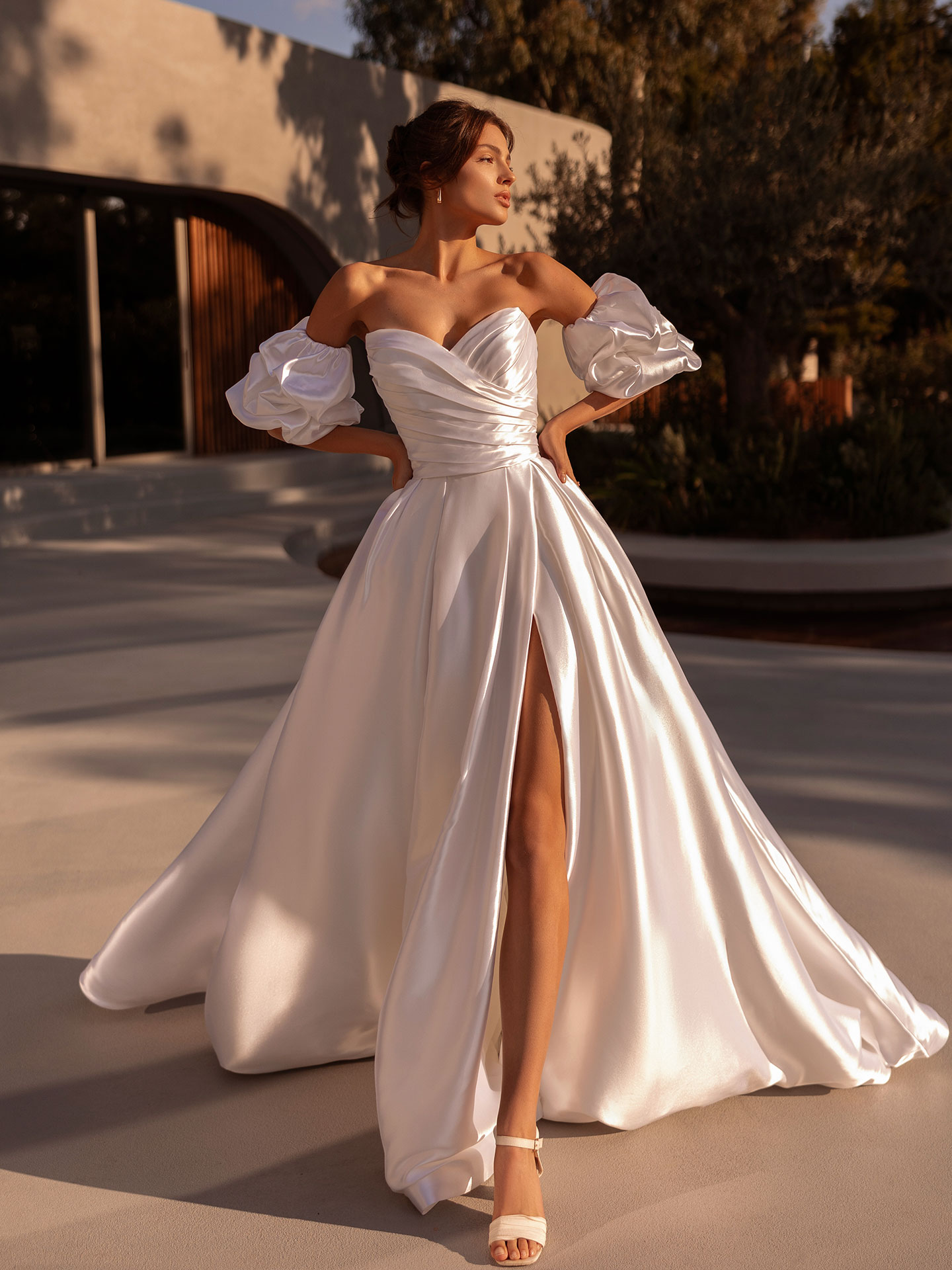 Minimalistisk elegans i sin renaste form. Rena linjer, skulpturala axelband och en strukturerad livdel i glänsande mikado – denna bröllopsklänning i prinsessmodell förmedlar tidlös sofistikation med ett modernt uttryck.