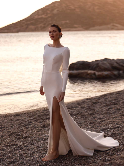 En stilren, figurnära crepeklänning med hög slits, illusion-ärmar och lövformade spetsapplikationer. Den höga ringningen och det skulpterade livet ger en kunglig känsla till denna vågade men också eleganta look.