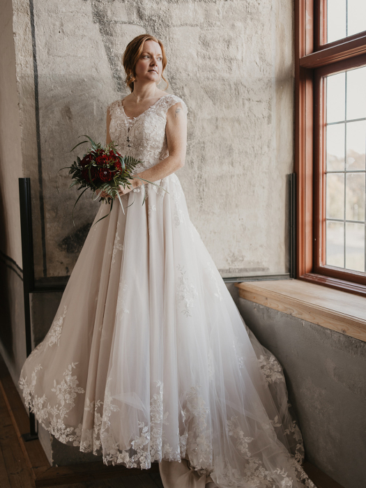 Släpet i kapellängd är dekorerat med tonala spetsapplikationer och avslutas med knappar som löper från ryggen hela vägen ner. En version med fodrat liv finns tillgänglig som modell 88410LND.