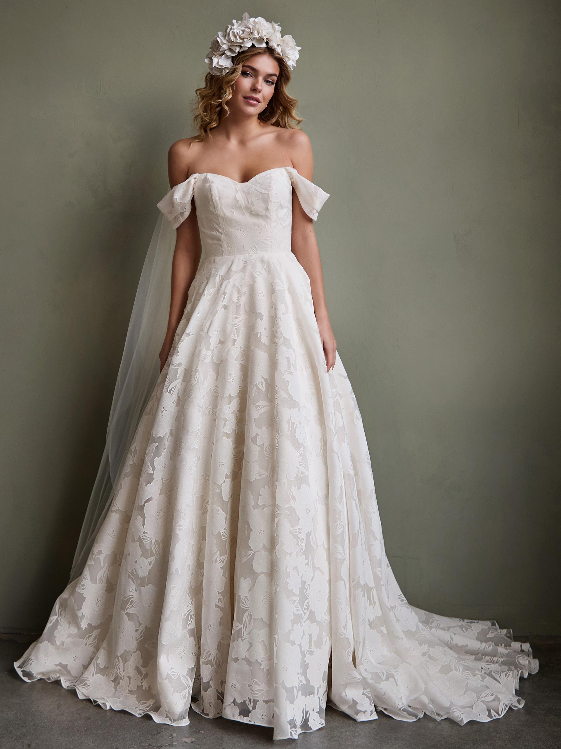 Romantisk bröllopsklänning i modern tappning med off shoulder urringning.