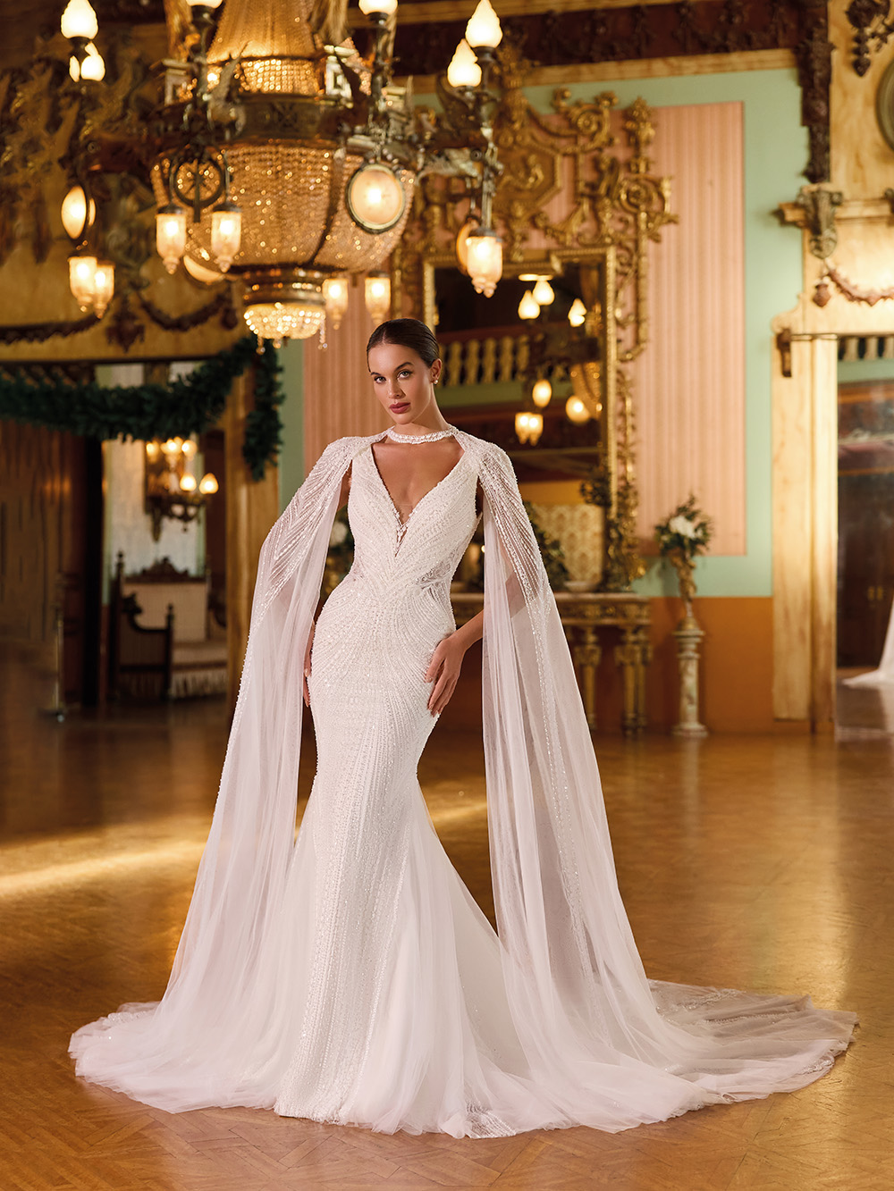 En hisnande sjöjungfruklänning dekorerad med pärlor och pärlbroderier över ett spetsmönstrat foder. Den djupa V-ringningen och den formande silhuetten utstrålar sofistikation, medan den avtagbara capen ger en eterisk känsla.