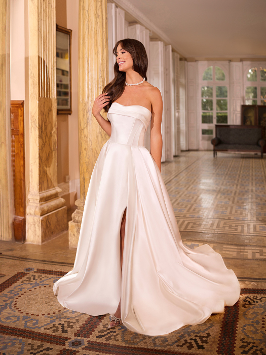 En utsökt klänning med ett pärlbroderat korsettliv, halterneck-ringning och två kjolalternativ: slank crepe med slits eller mjuk chiffong. Förhöj looken med eleganta axelapplikationer och overskirt 8082 i Mikado eller satin, med draperat midjeband och snörning i ryggen för extra stöd.