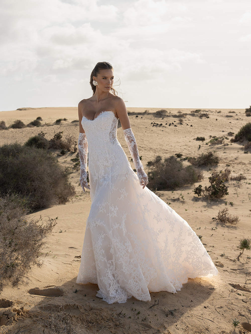 En romantisk bröllopsklänning i spets med axelbandslös hjärtformad ringning och fin blomsterbrodyr.