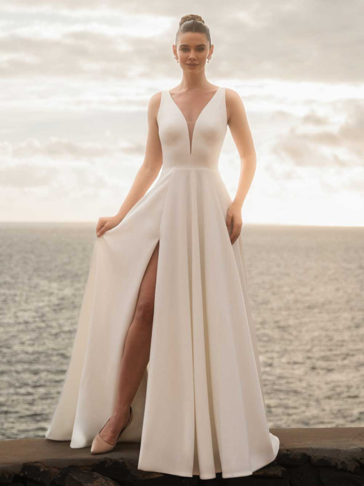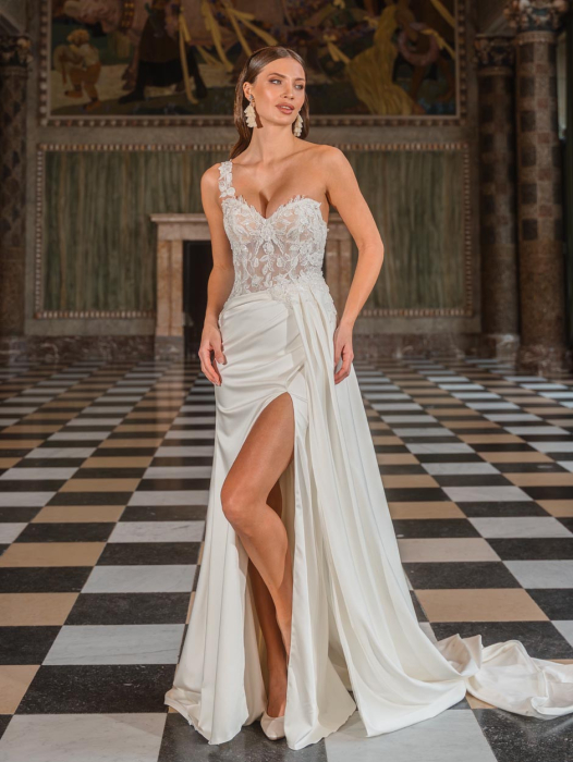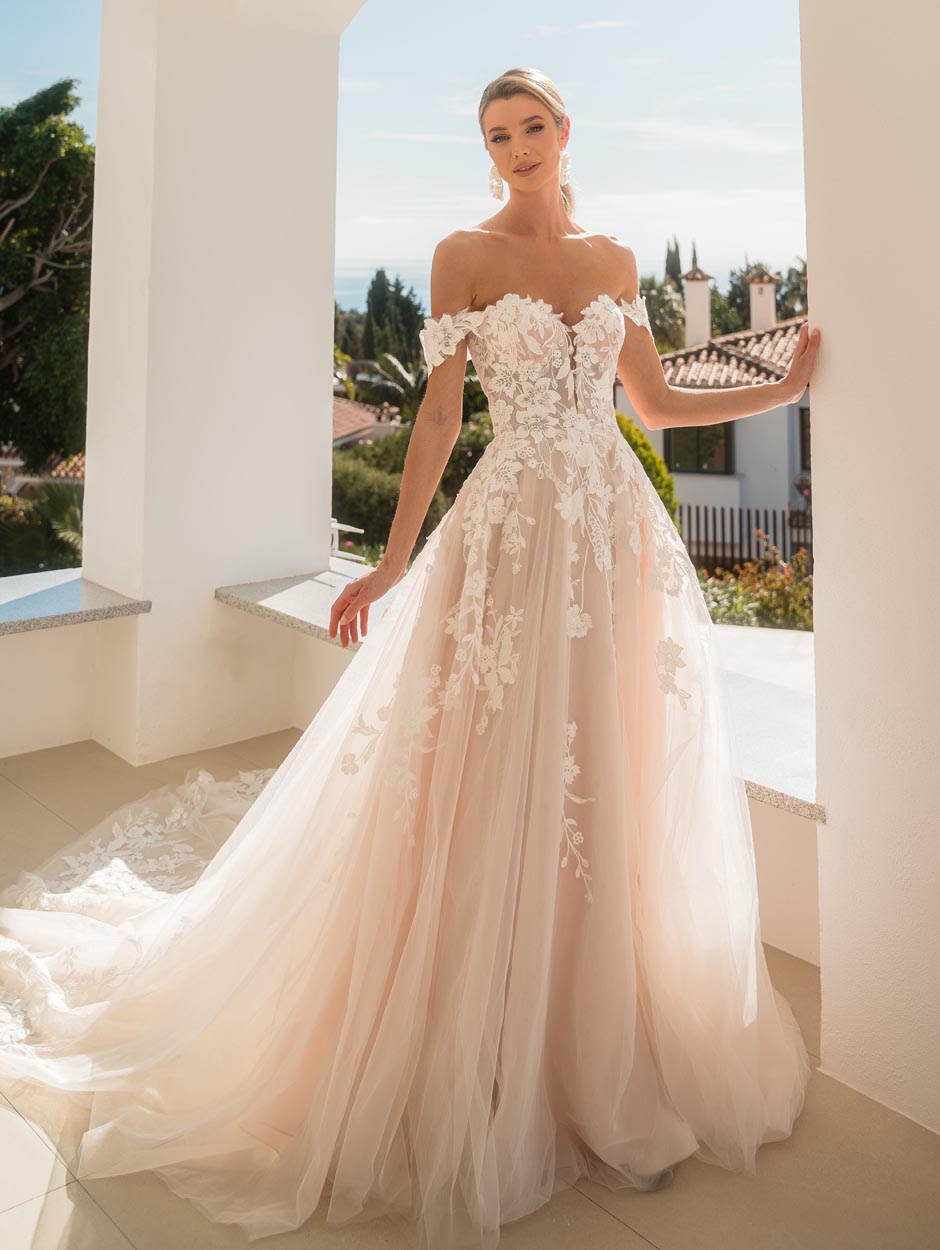 En romantisk A-linjeformad bröllopsklänning med 3D-spets, skimrande tyll och djup sweetheart-ringning. Den dramatiska spetskanten på släpet ger extra wow-känsla.