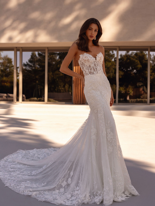 Denna eleganta A-linjeformade bröllopsklänning är skapad i luftig tyll och pryds av ett romantiskt korsettliv med broderad spets över byst och liv. Tunna, broderade partier över axlarna och de trekvartslånga ärmarna ger en sofistikerad och sirlig känsla. Framtill ramas klänningen in av en klassisk båtringning, medan ryggen överraskar med en djup, vacker V-skärning. Den utsvängda kjolen faller lätt och ger silhuetten en sagolik charm – perfekt för bruden som söker en tidlös elegans med detaljernas magi. Klänningen finns hos Ruths i Västerås.