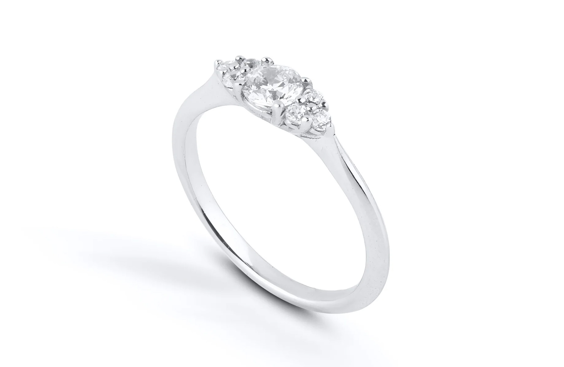 Diamanterna är briljantslipade och infattade i en luftig trådfattning som maximerar ljusinsläppet och framhäver stenarnas naturliga lyster. Den lätt upphöjda skenan smalnar av mot klustret och skapar en elegant silhuett.