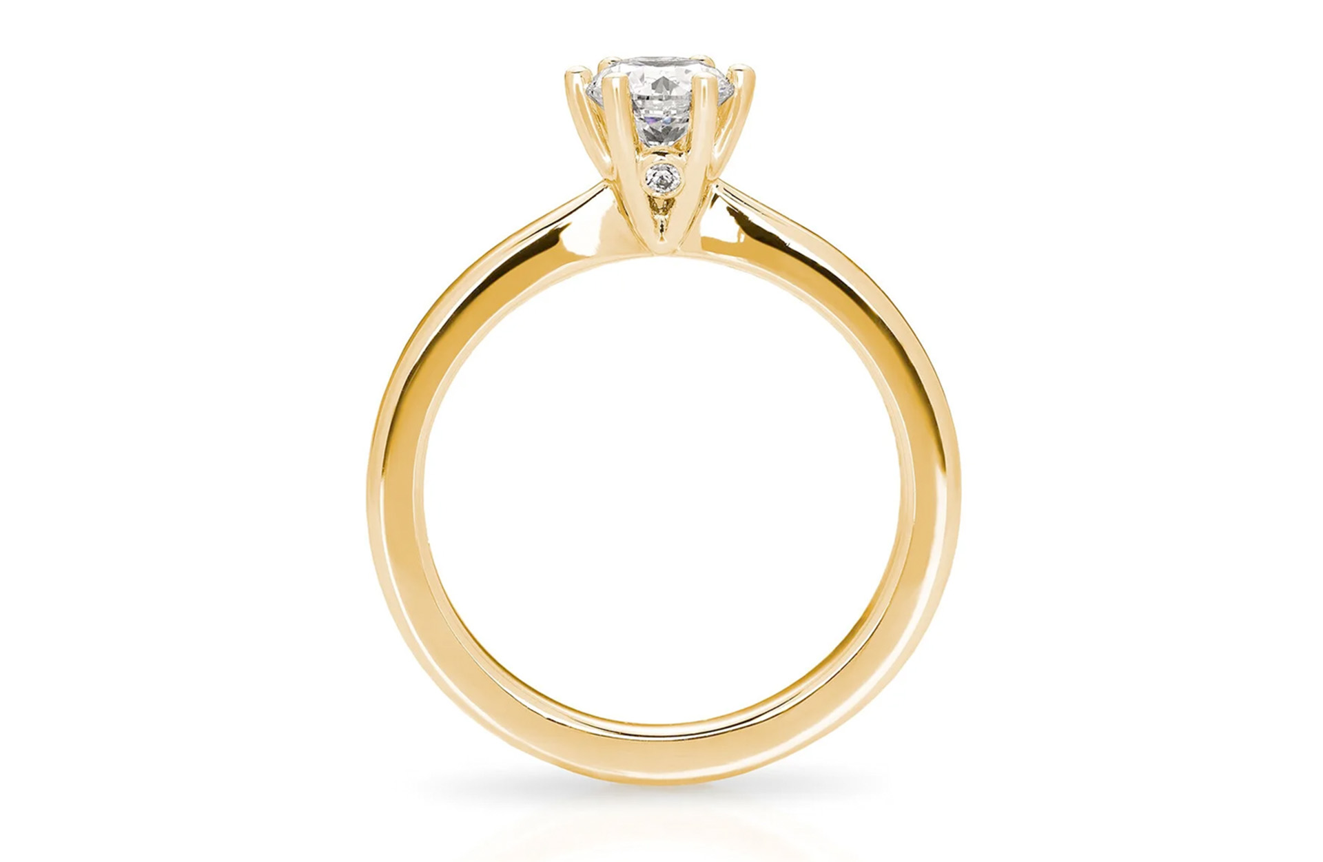 En vacker elegant enstensring som omsluts av en sexklo fattning med två mindre diamanter som både klär och stärker sidorna på fattningen.