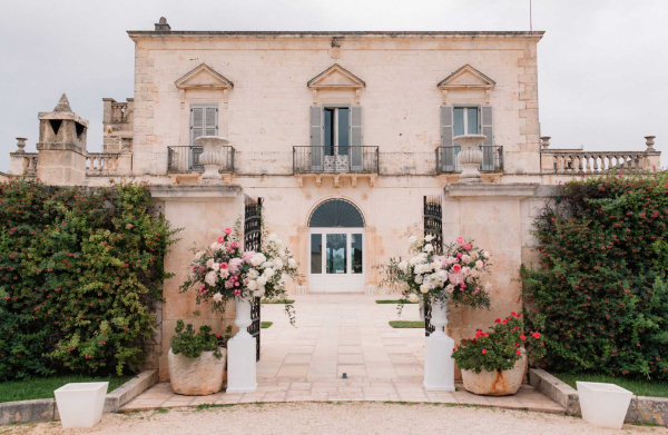 Magiskt sagobröllop på 1700-talsslott med mytiska statyer och gnistrande kristallkronor, blommande trädgårdar och gröna alléer.